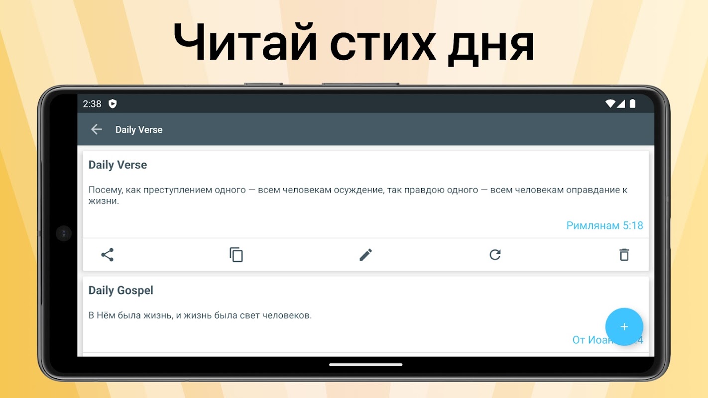 该应用程序设有“儿童圣经”版块。其中包含简化的圣经故事、改编的耶稣基督寓言、儿童祈祷文和彩色插图。这种格式有助于以易于理解的形式向儿童介绍基督教信仰的基础知识。