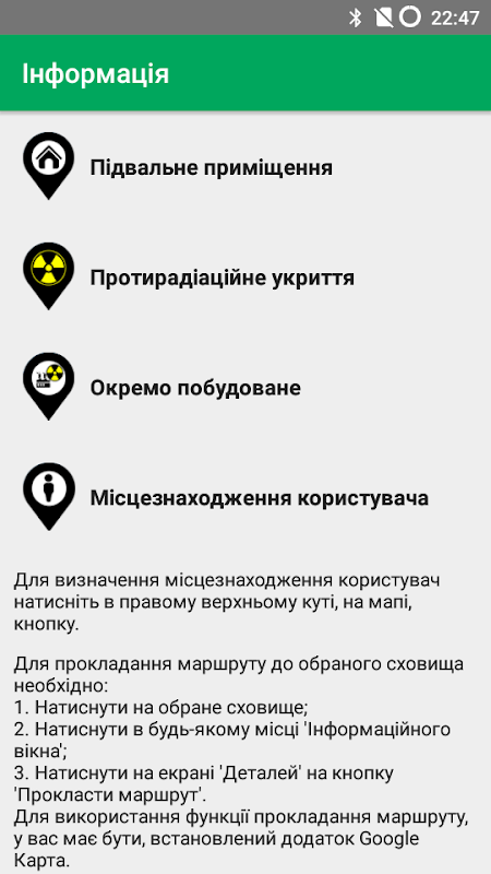 Мобильное приложение для Android "Бомбоубежища Конотопа" было специально разработано для информирования населения о местах укрытия от чрезвычайных ситуаций техногенного, природного и военного характера .