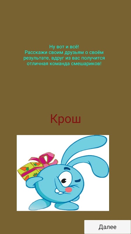 Смешарики очень популярный мультсериал в России, некоторым наверно будет интересно узнать на кого из любимых персонажей они больше всего похожи. Советую скорее пройти тест и узнать. Возможно ты веселый Крош или воспитаный Ежик, укуси меня пчела, а вдруг ты Копатыч?