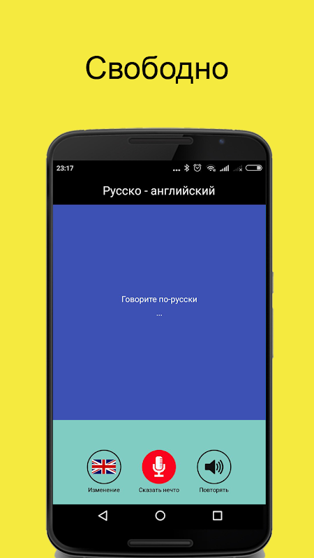 Напротив, другой человек может также сказать что-то на английском языке, и приложение переведет на русский язык с текстовым выходом, а также голосом.