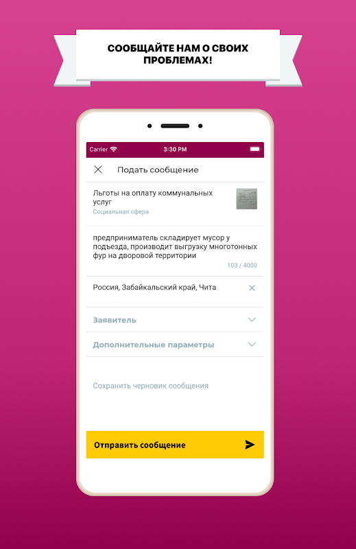 通过移动应用程序,您可以实时报告与Transbaikalia居民有关的问题:道路坑洞,院子和操场的改善,供热问题,管理公司的工作等等。