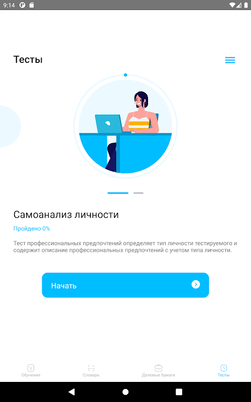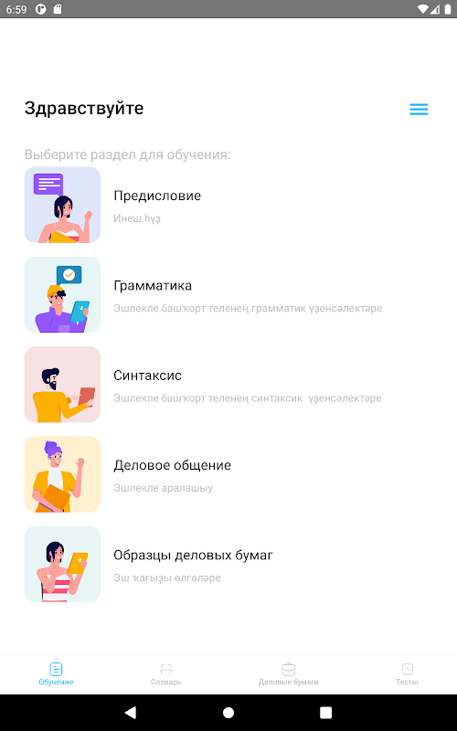 这个移动应用程序是一个交互式学习指南,结合了商务巴什基尔语言课程的基本理论信息、商务沟通文化、独立工作作业和一本简短的俄语-巴什基尔官方商务词汇词典参考书。附录包含商务交流过程中最常编译的商务论文样本,以及掌握材料水平和专业自省的测试系统。