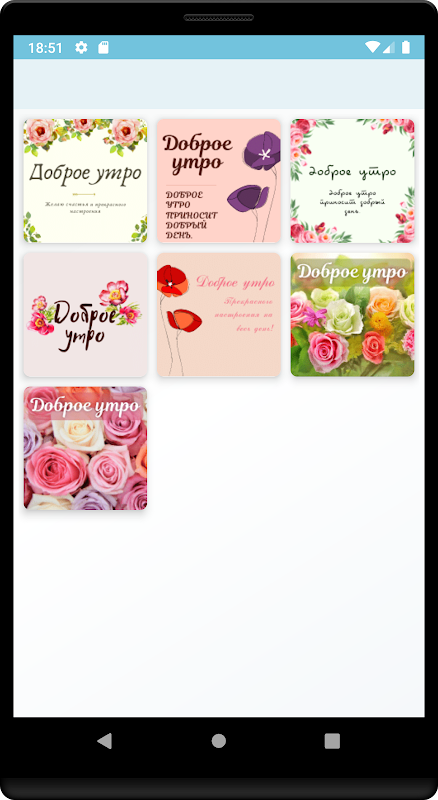 Приложение содержит 3 категории, каждая из которых содержит доброе утро в картинках. На некоторых изображениях есть красивые фразы.