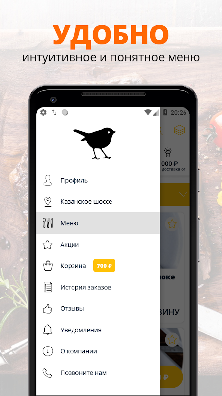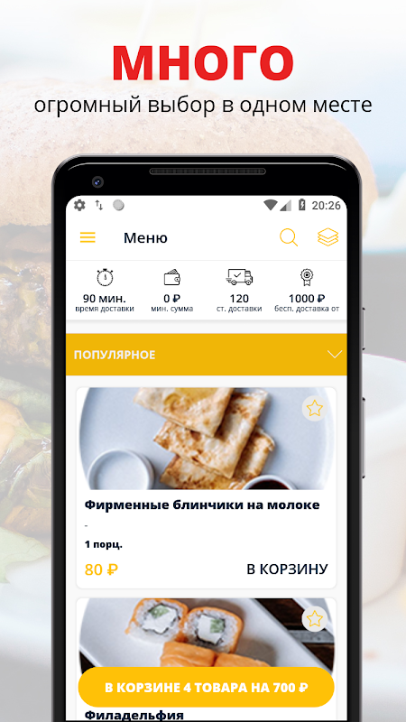 Мы предоставляем возможность удобно и быстро получить качественную услугу. В нашем приложении Вы можете заказать как привычные блюда- роллы, пиццу и бургеры, так и «Картофельный Краш» в паре с «Рибаем» из любимого ресторана. Будьте уверены, каждое блюдо упакуют в термопакет, положат с сохраняющую тепло сумку и привезут в кратчайшие сроки.