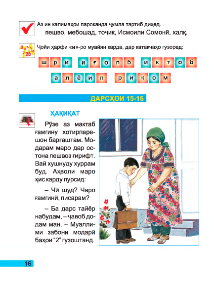 Шумо баъд аз хатми синфи якум як зина боло, ба синфи дуюм қадам ниҳодед. Агар имсол ҳам хубу аъло хонед, дар роҳи дониш як дам бапеш мегузоред. Орзуи мо, азизон, ин аст, ки ҳама фанҳоро нағз омузед, ба сухану насиҳатҳои муаллими меҳрубон ва падару модарон гуш кунед. Ҳамаи одамони калонсол ба шумо умри дароз, тансиҳати ва дар таҳсилатон муваффакият мехоҳанд. Мехоҳанд, ки шумо калон шавед, соҳиби маълумот гардед, ба падару модар ва ҳам Ватани азизамон хизмат кунед. Ин китоб барои шумо навишта шудааст. Хонед ва аз панду ҳикматҳояш баҳра манд гардед. Онро покиза нигоҳ доред. Фаромуш накунед, ки соли оянда ин китобро хоҳар ё додарони шумо мехонанд.
