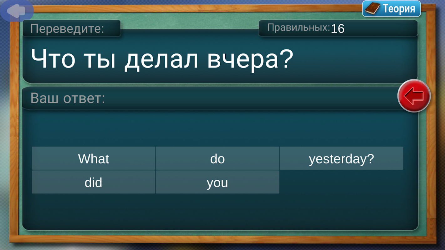 Программа предоставляет теорию составления предложений английского языка простым и доступным языком. В любое время вы можете подсмотреть и выучить то, что забыли, чтобы продолжить изучение.