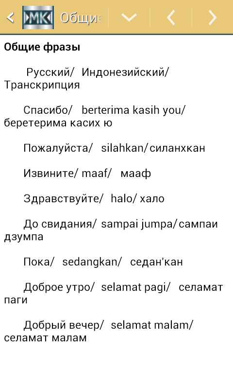 Русско-индонезийский разговорник. Предположим, вы приехали в другую страну и совершенно не владеете местным языком. Для того, чтобы проще общаться за рубежом и чувствовать себя как дома, предлагаем пролистать перед поездкой разговорник. В данном разговорнике вы найдете общие фразы и фразы на темы гостиница, магазин (покупки), транспорт, экстренные случаи, ресторан.