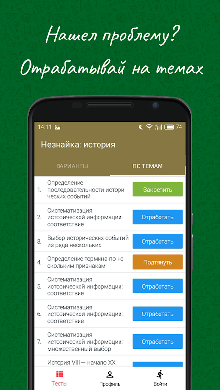 Если вы постоянно допускаете ошибки в одних и тех же заданиях, значит, есть смысл заглянуть в раздел "Темы", закрепить навыки на тематических вопросах.