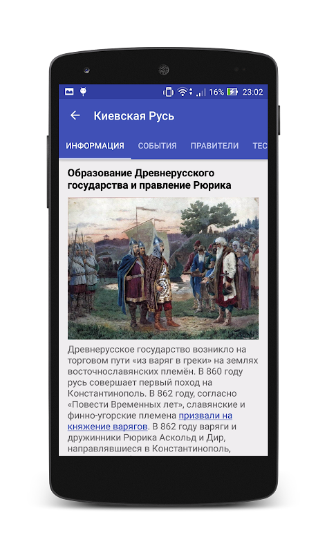 Приложение не стремится заменить научную книгу, но оно лучше, чем просто краткая история или набор фактов. Новый увлекательный способ изучения истории позволяет в процессе чтения статьи открывать новые статьи с помощью специальных ссылок. Таким образом, можно последовательно, шаг за шагом узнавать о происшедших событиях в истории России от Рюрика и до наших дней. После прочтения статьи Вы можете пройти тест, где Вам будет предложено некоторое количество вопросов. Это поможет закрепить пройденный материал, а Вы сможете перейти к другим статьям.