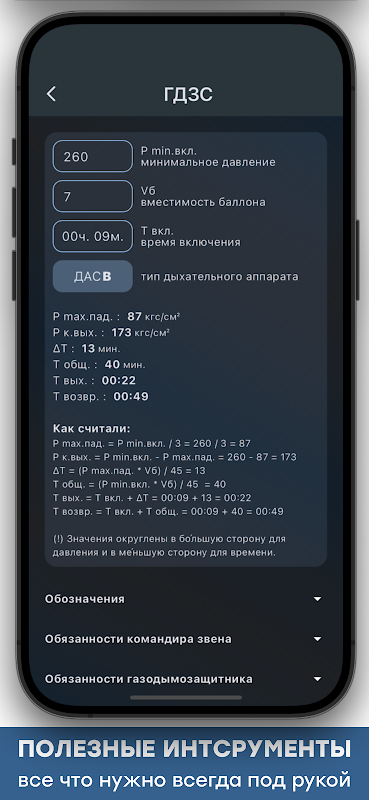 • GDZS(计算和信息):气体和烟雾防护服务的所有必要计算和参考数据随时可用。