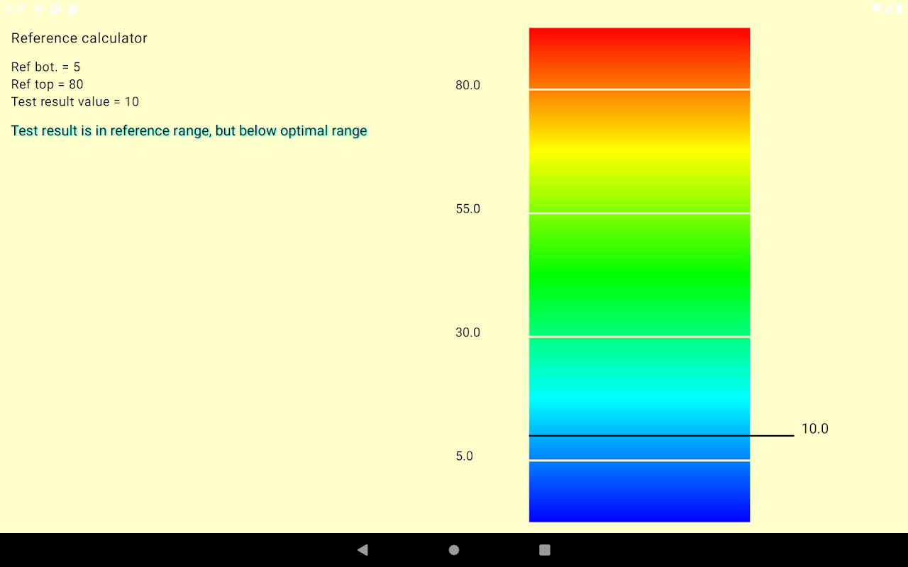 该应用程序允许您可视化医学测试的结果。该应用程序对于相关专家特别有用,他们可以快速直观地评估结果与正常限度之间的关系。