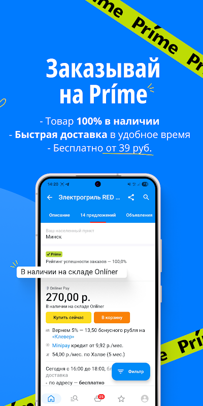 Onlíner Prime 是一项在明斯克和白俄罗斯境内从 Onliner 仓库快速配送商品的服务。我们保证商品 100% 可用,在指定时间快速送达,并方便退货。Onlíner Prime 的免费配送服务起价为 39 卢布,订单金额低于此金额时,配送费仅为 7 卢布。