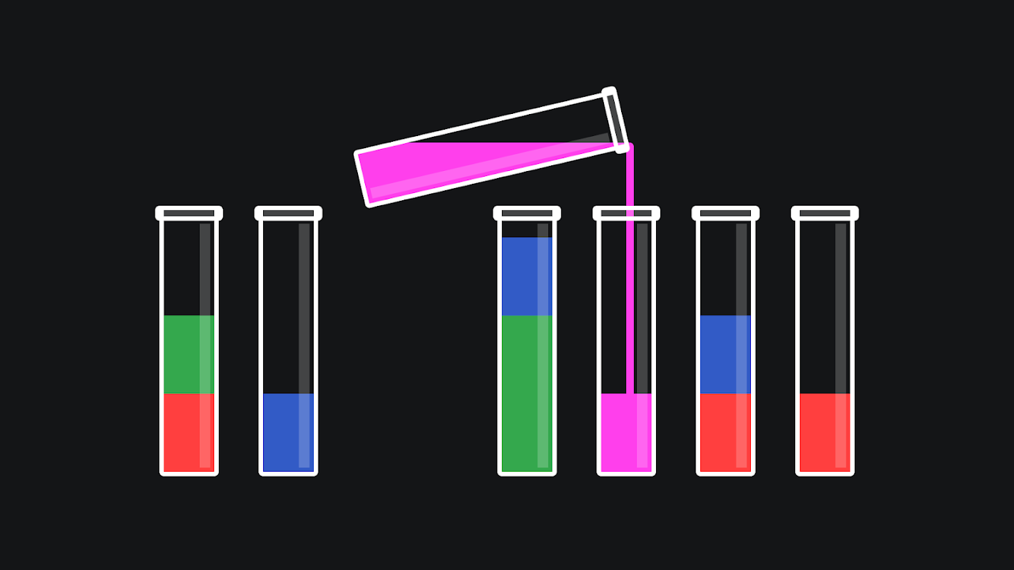 要选择烧瓶,请用手指单击它。接下来,选择另一个要倒水的圆锥体。并单击它。此后,液体将从一根试管移动到另一根试管。溢出是需要倒水的谜题。我们选择了令人愉悦的颜色,以便赏心悦目。
