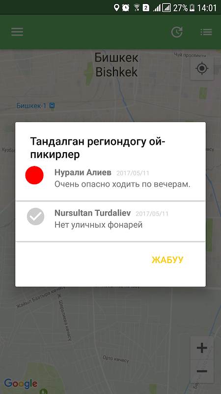 Тийешелүү аймактагы белгиленген жерлердин ой-пикирлерин окуу үчүн оң жана жогору жактагы тизме баскычын басуу жетиштүү. Баскан соң картада көрүнүп турган жердеги бардык ой пикирлер тизме катарында көрсөтүлөт. Ар бир колдонуучу өзүнүн ой-пикирин өчүрүп салууга болот.