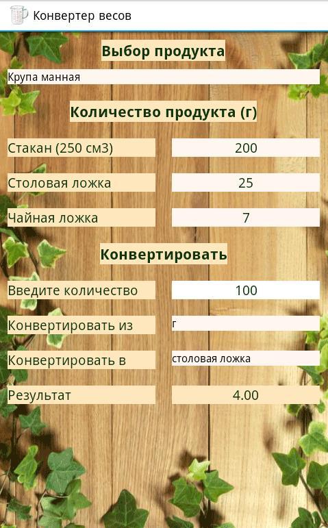 "Кухонный калькулятор" поможет пересчитать вес и объем продуктов, вычислить количество сахара и воды, чтобы сделать сахарный сироп, рассчитать количество соли для рассола, найти количество уксуса и воды при приготовлении растворов уксуса разной концентрации.