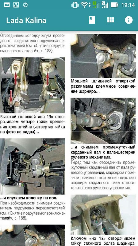 Руководство по ремонту, эксплуатации и техническому обслуживанию автомобилей ВАЗ 1118, ВАЗ 1119, ВАЗ 1113 Lada Kalina, с 8 клапанными двигателями рабочим объемом 1,4 л и 1,6 литра, с 16 клапанным двигателем рабочим объем 1.6 литра. В руководстве приведены технические характеристики Лада Калина, основные неисправности автомобиля и способы их устранения. Особое внимание уделено ремонту двигателя, системы управления двигателем, трансмисии, рулевого управления, кузова, электрооборудования. В отдельные разделы пособия входят инструкция по эксплуатации Лада Калина, моменты затяжки основных резьбовых соединений, перечень устанавливаемых на автомобиль подшипников качения и схемы электрооборудования (электросхемы) автомобиля. Следует отметить, что ремонт может быть произведен в условиях гаража с использованием минимального количества самого простого инструмента. Простая структура приложения ещё больше облегчает использование. Приложение предназначено для владельцев автомобилей Лада Калина, работников СТО и автосервисов.