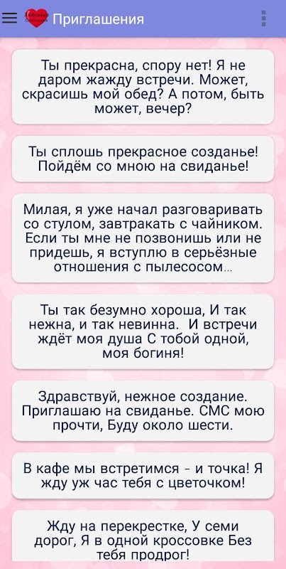 Любовные Сообщения - это лучший сборник любовных смс, состоящий из большого количества любовных сообщений, не требующий доступа к интернету. Теперь можно не ломать голову, придумывая оригинальное SMS. Данное приложение поможет признаться в любви дорогому Вам человеку, написать комплимент, рассказать о своих искренних чувствах любимым. Позволяет сразу из программы отправлять смс.