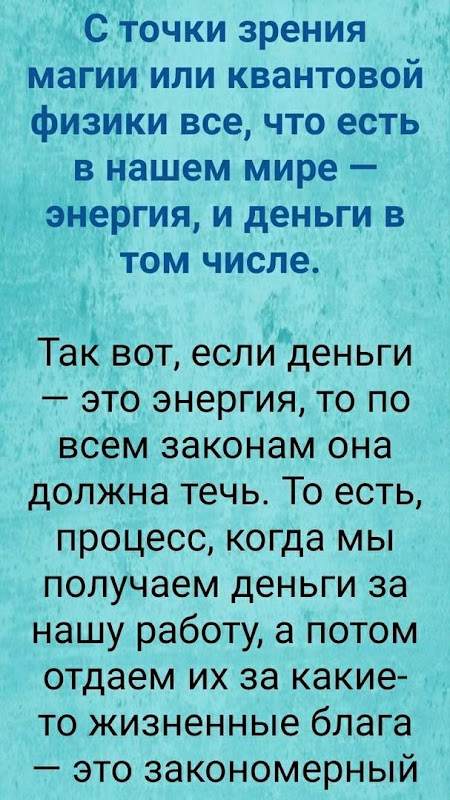 Так вот, если деньги — это энергия, то по всем законам она должна течь. То есть, процесс, когда мы получаем деньги за нашу работу, а потом отдаем их за какие-то жизненные блага — это закономерный процесс, т.к. природа любой энергии — свободное течение, поток.