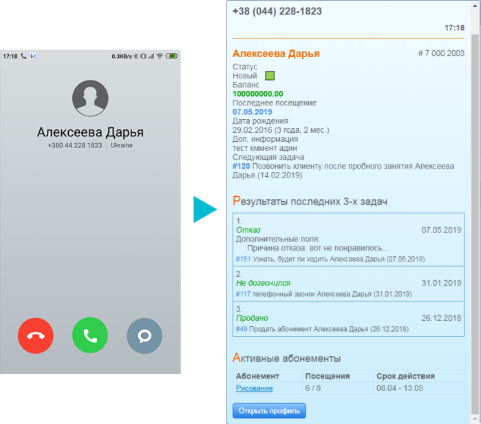 • Видеть в браузере карточку клиента с основной информацией по нему при входящих звонках на мобильный телефон. Карточка отображается на активной вкладке браузера.