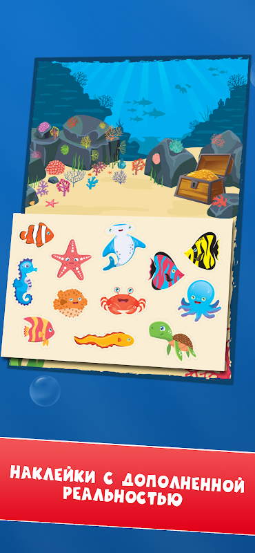 Приложение с дополненной реальностью (AR). Меткой является наклейки морских обитателей. Пользователь наклеивает наклейку морского обитателя на любую плоскость. Затем, устанавливает на свой телефон с приложение "Морские обитатели", запускает его, наводит на наклейку и получает игровую анимированную сцену дополненной реальности (AR).