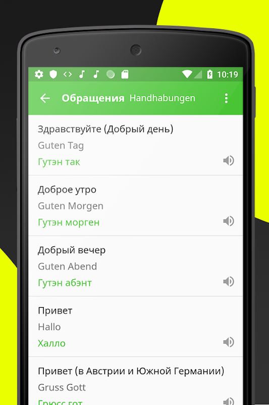 离线德语短语可以播放每个短语。这将有助于在初始阶段免费和高质量地学习德语。你不需要去俄语 - 德语词典找到这个词的转录。该申请立即以俄语转录。