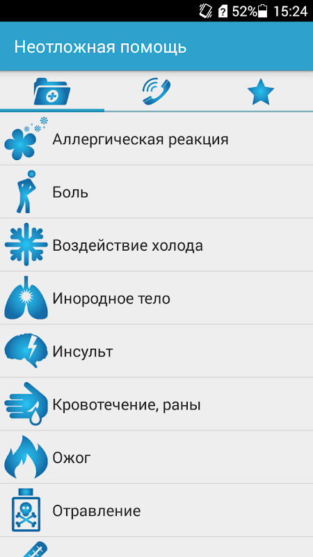 "Неотложная помощь" (первая помощь) является приложением-справочником по оказанию первой помощи пострадавшим или больным людям в различных экстремальных и критических ситуациях. Приложение содержит перечень неотложных действий в ожидании медицинской помощи, номера телефонов экстренных служб, а также перечень содержимого аптечки первой помощи.