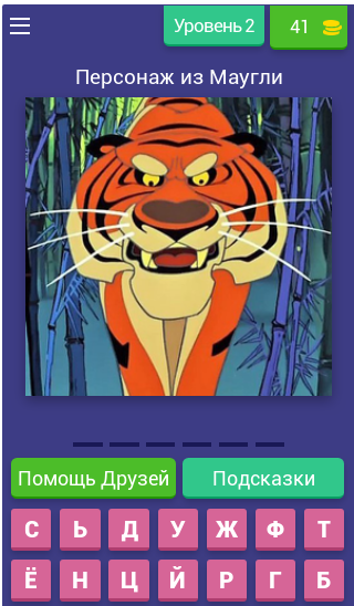 В приложение встроена система подсказок. Если не сможете вспомнить название мультипликационного героя, то смело пользуйтесь этой функцией. Она поможет пройти эту викторину до самого конца.