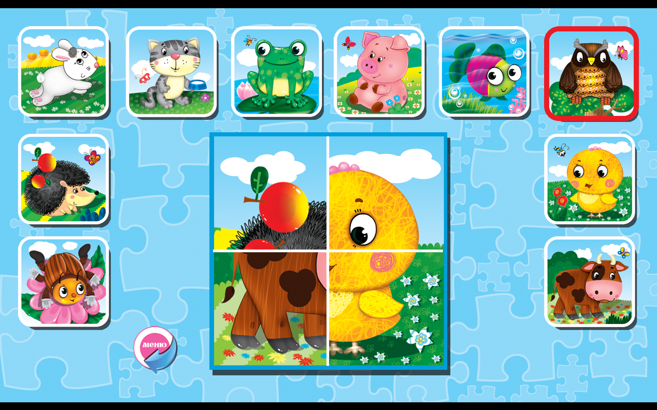 Эта увлекательная игра для развития и обучения состоит из 2-х режимов: «Весёлые зверята» и «Времена года». В режиме «Весёлые зверята» можно собрать из кубиков 10 картинок с изображением различных животных. В режиме «Времена года» можно собрать из кубиков 4 картинки с изображением различных времён года.