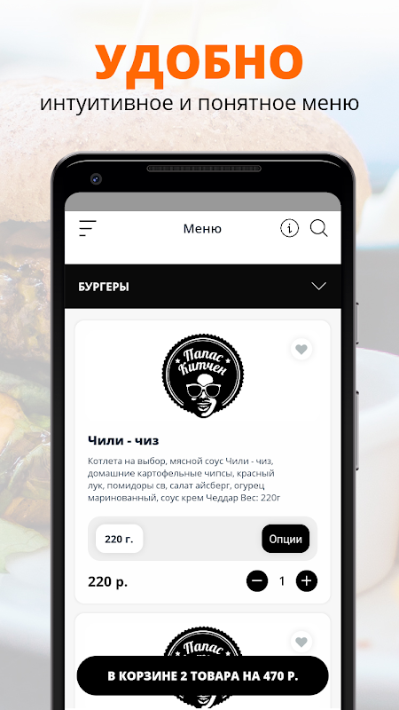 汉堡是世界上最受欢迎的快餐之一。传统上,这种类型的三明治由整齐地折叠在两个面包之间的配料组成:肉排、生菜、番茄片和一片奶酪。但使用特殊的调味料和酱汁,我们的厨师能做出真正的杰作。您可以在 Papas Kitchen 订购下诺夫哥罗德最美味的汉堡。你想重复的汉堡!