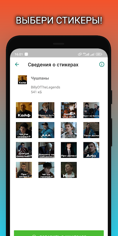 您会发现电报和 Whatsapp 的有趣贴纸,其中包含您最喜欢的系列中的角色,带有文本 Marat、Aigul、Turbo、Yellow、Coat、Koschey 的贴纸,带有男孩模因的有趣贴纸,带有可爱角色的贴纸,带有来自邪恶角色的贴纸系列、Chushpanami 动画贴纸和许多孩子气的模因!