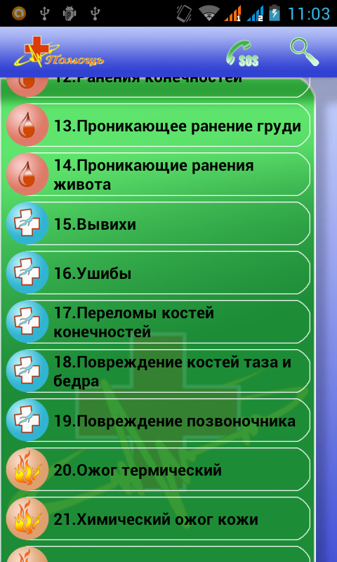 Приложение-справочник Первая помощь позволяет всегда иметь под рукой краткие инструкции по оказанию первой (доврачебной) помощи в различных экстремальных ситуациях (авария, перелом, порез, кровотечение, отравление).