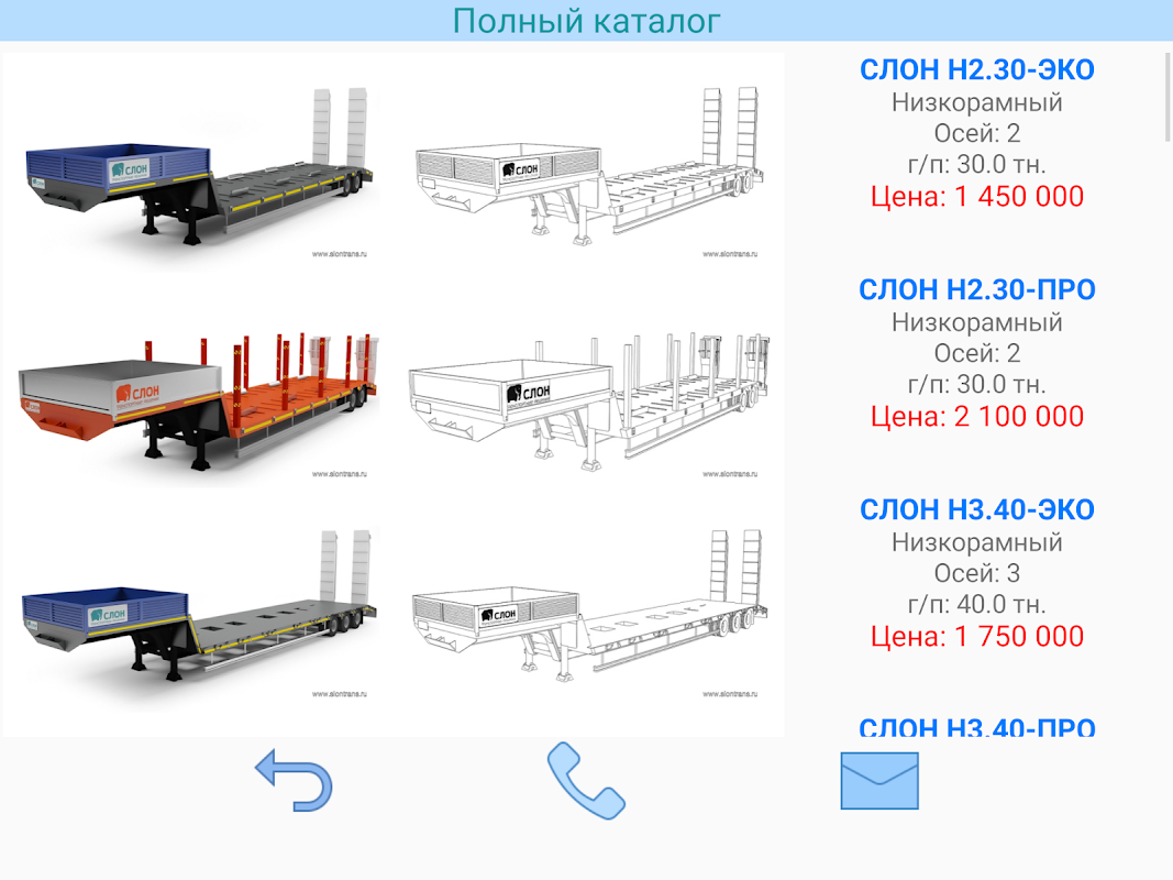 Приложение содержит обновляемый каталог тяжёлых полуприцепов СЛОН грузоподъемностью от 10 до 100 тонн с ценами и техническими характеристиками.