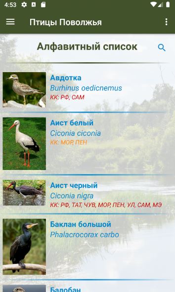 生活在伏尔加河中部地区的鸟类图谱识别器,附有照片和声音。