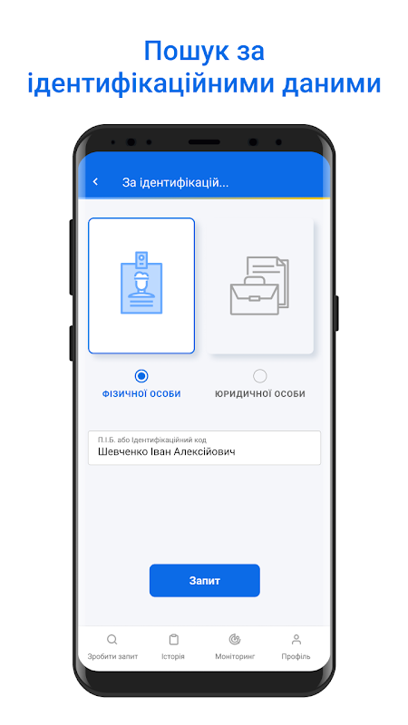 通过身份信息搜索 - 要通过身份信息进行搜索,您需要输入自然人的全名或身份代码,或者法人实体的 EDRPOU 名称或代码;