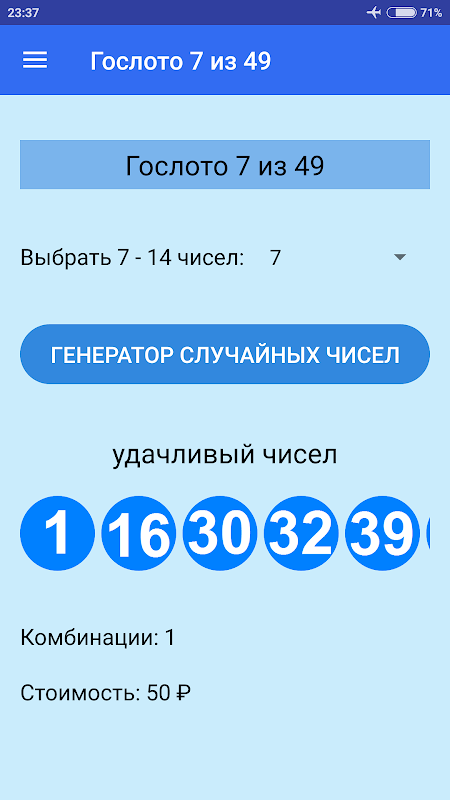 With this free app you can select random numbers for the games GOSLOTO 6 out of 45, GOSLOTO 5 out of 36, GOSLOTO 4 out of 20, GOSLOTO 7 out of 49, Sportloto Matchball and each other lotto game.