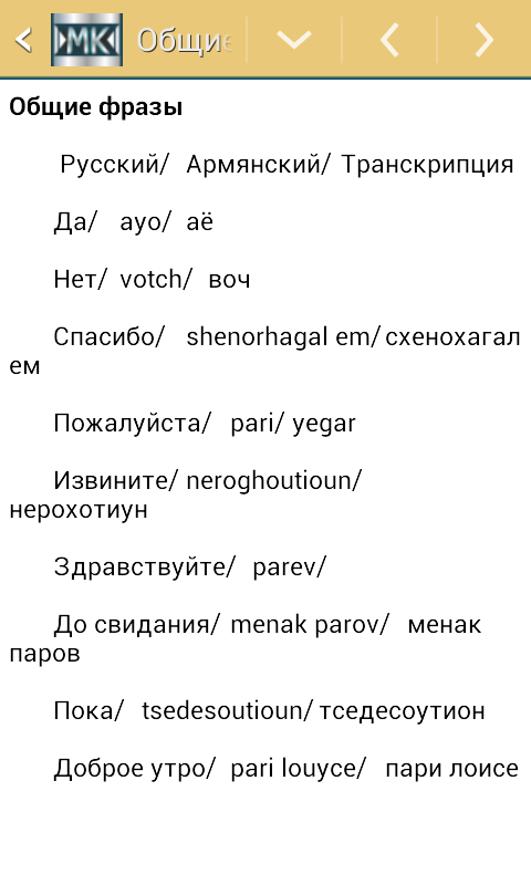Русско-армянский разговорник. Предположим, вы приехали в другую страну и совершенно не владеете местным языком. Для того, чтобы проще общаться за рубежом и чувствовать себя как дома, предлагаем пролистать перед поездкой разговорник. В данном разговорнике вы найдете общие фразы и фразы на темы гостиница, магазин (покупки), транспорт, экстренные случаи, ресторан.