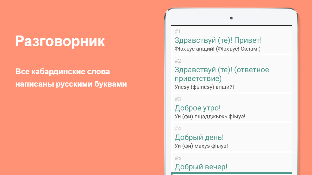俄语-Kabardian短语集可以分别用作短语集和学习Kabardian语言的工具。所有Kabardian单词均以俄语字母书写,并分为45个逻辑主题,即,该短语手册是为俄语用户(游客)设计的。