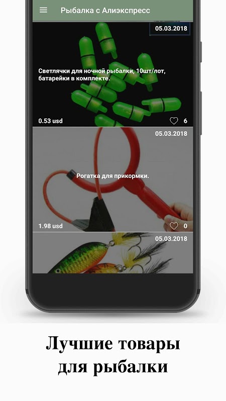 Рыбалка с Али - это постоянно обновляемое приложение с отборными рыболовными товарами из Китая. В приложении публикуются только лучшие снасти для рыбалки по низкими ценами из интернет-магазина Али экспресс. Названия всех товаров на понятном русском языке. Здесь вы найдете все для рыбалки: эхолоты (ехолот), воблеры, приманки, удочки, одежду, навигатор, рыбацкий барометр, узлы, рыбацкие крючки, инструменты и многое другое для рыбалки. Покупая товары на Али летняя рыбалка, подводная и зимняя рыбалка станут для вас более доступными. Смотрите товары, сравнивайте цены и оформляйте заказы. Рыболовный интернет-магазин из площадки Алиэкспресс доставляет снасти из Китая во все регионы России, Украины, в Белоруссию и Казахстан.