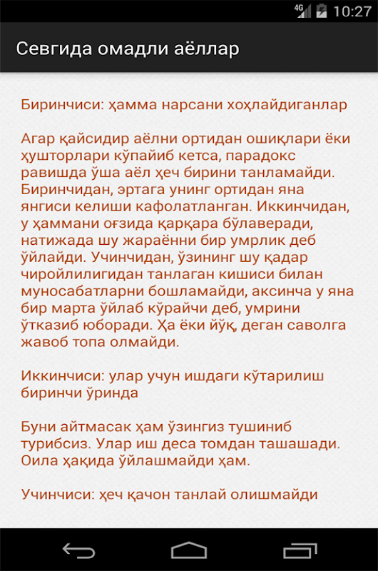 Чунки, ўзбекона турмушимизда, аниқроғи оилада юзага келаётган муаммоларнинг аксарияти ушбу иловада келтирилган маълумотлар орқали бартараф этилиши турган гап. Сиз бир ҳафсала қилиб уни охиригача мутолаа қилиб чиқинг. Кўп нарсани шунда билиб оласиз.