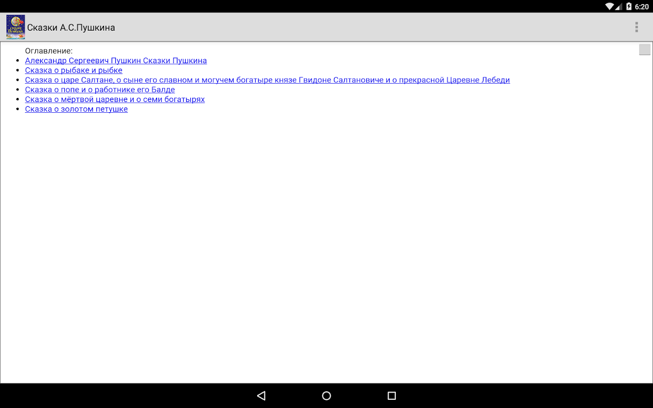 В сборнике представлены сказки А. С. Пушкина «Сказка о рыбаке и рыбке», «Сказка о царе Салтане», «Сказка о попе и о работнике его Балде», «Сказка о мертвой царевне и о семи богатырях», «Сказка о золотом петушке». На этих произведениях воспитывалось не одно поколение и должны вырасти современные дети. Как и все книги данной серии, издание красочно иллюстрировано.