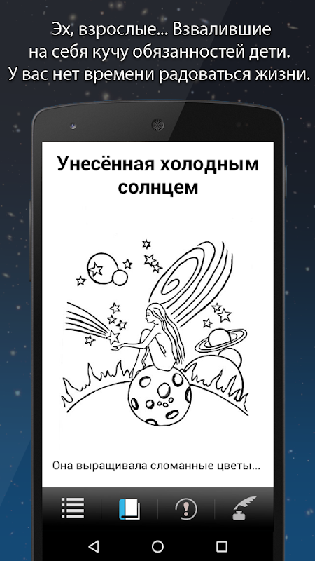 В этом приложении вы сможете читать это произведение и рассмотреть иллюстрации, сделанные автором. И так же послушать его в исполнении автора. После запуска оно скачает все необходимые аудио файлы и будет работать вне сети.