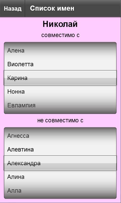В полной версии (https://play.google.com/store/apps/details?id=air.ru.astraport.sovmestimostimenpro) - вывод для каждого имени двух списков: совместимые и не совместимые имена для выбранного имени.