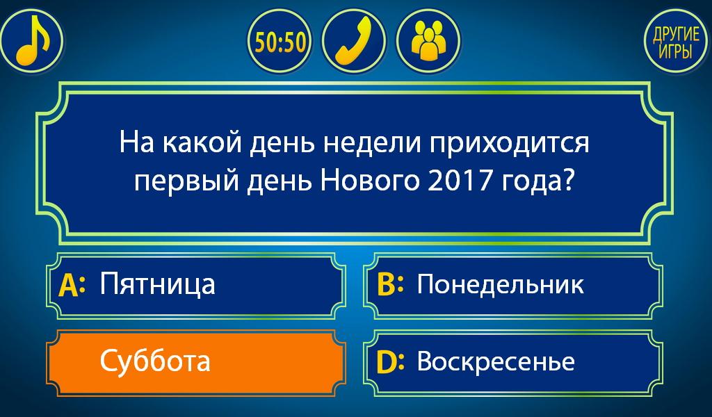 Самая новая и интересная игра миллионер, в которой вы можете стать миллионером, перед вами! В этой игре необходимо пройти 15 уровней, в которых отгадать 15 вопросов из различных областей знаний и заработать целый миллион!