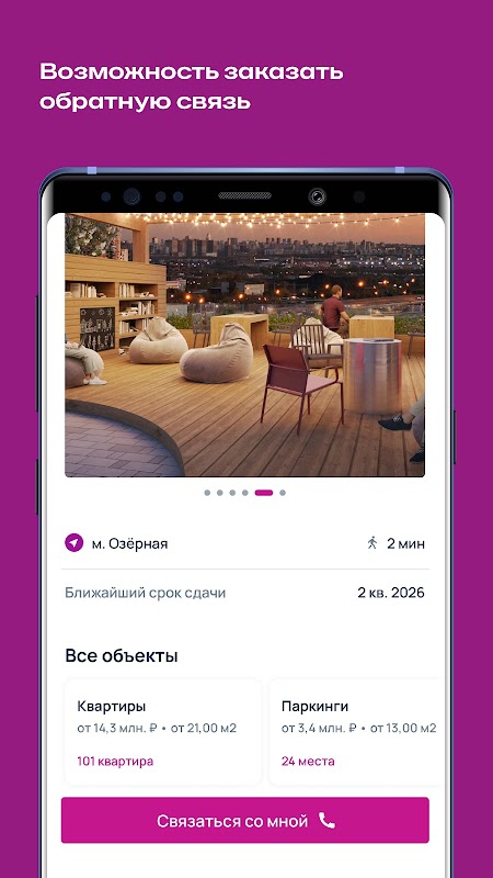 您所需的一切:從選擇公寓到獲取鑰匙以及入住新家,現在都在一個便捷的應用程式中。該應用程式適合那些計劃從開發商購買公寓並對莫斯科、新西伯利亞、秋明和葉卡捷琳堡的新建築感興趣的人。