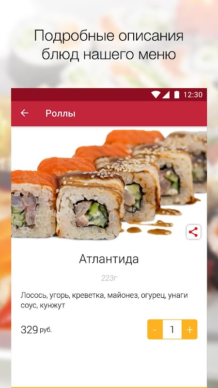 В специально составленном меню есть не только суши, но и WOK, супы, горячие блюда и даже бизнес-ланчи! Роллы, темпура, пицца и десерты – теперь это все на расстоянии клика!