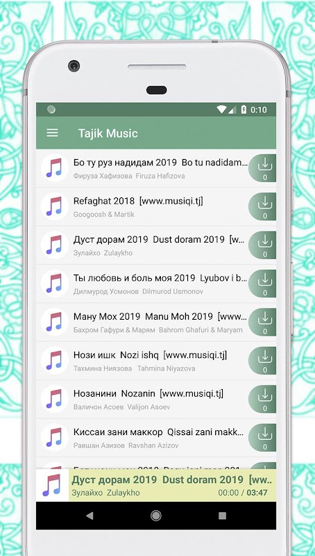 塔吉克斯坦最近和最受欢迎的热门歌曲现在收集在一个应用程序中。收听您最喜欢的塔吉克歌曲。您还可以免费下载任何mp3格式的歌曲。方便的搜索将帮助您找到您需要的数千首歌曲。只有来自现代流行明星的新作品:Shabnami Surayo,Nigina Amonkulova,Farahmand Karimov,Zulaikho和其他艺术家。最适合你的音乐!