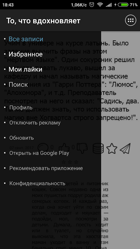 Понравившиеся записи можно комментировать и оценивать. Все понравившиеся картинки можно сохранять в галерее устройства в папке приложения. Ты можешь делиться записями с друзьями через социальные сети Facebook, Вконтакте, Одноклассники, Viber, WhatsApp, а так же другие установленные на устройстве приложения. Ну и конечно, ты можешь оставлять лайки и сохранять записи в избранное.