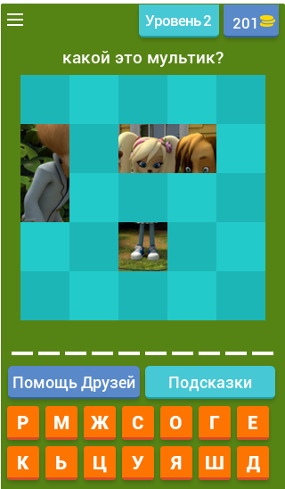 Изображение закрывают плитки, открыв часть картинки нужно догадаться как называется мультфильм или герой. (В зависимости от вопроса).