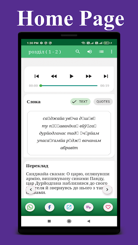 The Apps contains a veriety of material, presented in a manner which is easily accessible: the entire 700 verses of the Ukranian Bhagavad Gita chapters are in Devanagari with a Ukranian transliteration, followed by an Ukranian translation, (ANVAYA the prose order of the Sanskrit words) and word by word meaning. Each verse has been traditionally chanted to illustrate the sound and beauty of the Sanskrit language. In addition, miscellaneous writings and extensively interlinked indexes give much to the scholar to work with. These includes a Quarter-verse Index, a Subject Index, and a Word Index which lists all the words in the Ukranian Bhagavad Gita alphabetically along with their grammatical analysis. Hundreds of visuals have been used to give each page its own mood and atmosphere, at times bordering on the sublime. Last but certain not the least, it contains the entire text of Sri Aurobindo’s ‘Essays on the Bhagavad Gita ’. You can also understand Bhagavad Gita in Ukranian . Bhagavad Gita essays in Ukranian has also been provided.