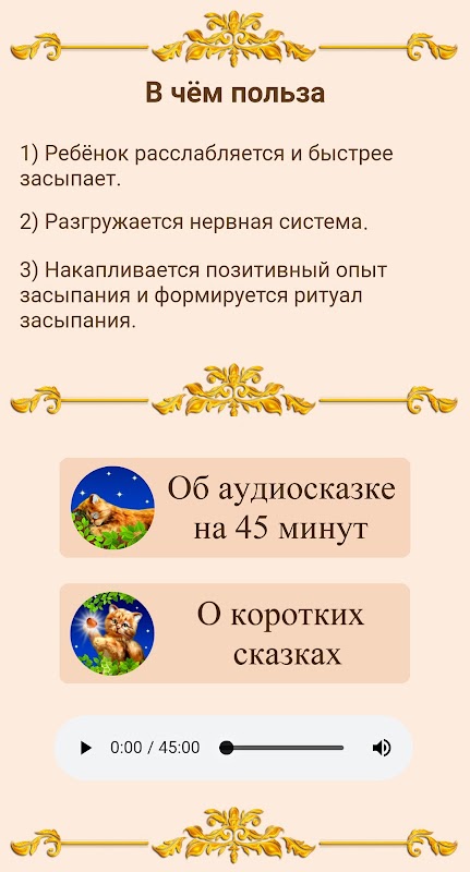 在应用程序中,魔术猫Ogonyok将告诉您如何入睡: